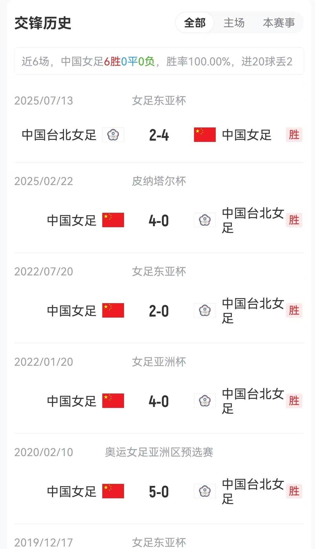 2026-03-13雨燕直播,NBA直播,世界杯直播,足球直播,台球直播,体育直播,世界杯,欧洲杯,苏超直播,村BA直播,苏超联赛,村超,村超直播根据中国足协官网的统计数据,中国女足与中国台北女足在国际A级赛事中历史交锋26次,战绩是惊人的26战全胜。 在这26场比赛中,中国女足累计打入了87粒进球,而仅仅丢失了2球。 双方在女足亚洲杯赛场上的7次交手,中国女足同样保持全胜,并且在这7次交手的当届赛事中,中国女足最终都夺得了冠军。 最近的一次交锋发生在2025年的东亚杯上,当时中国女足在2-0领先的情况下,被对手连追两球扳平,最终凭借王妍雯和邵子钦的进球,以4-2险胜。 这仅有的两个失球,也全部来自那场比赛。