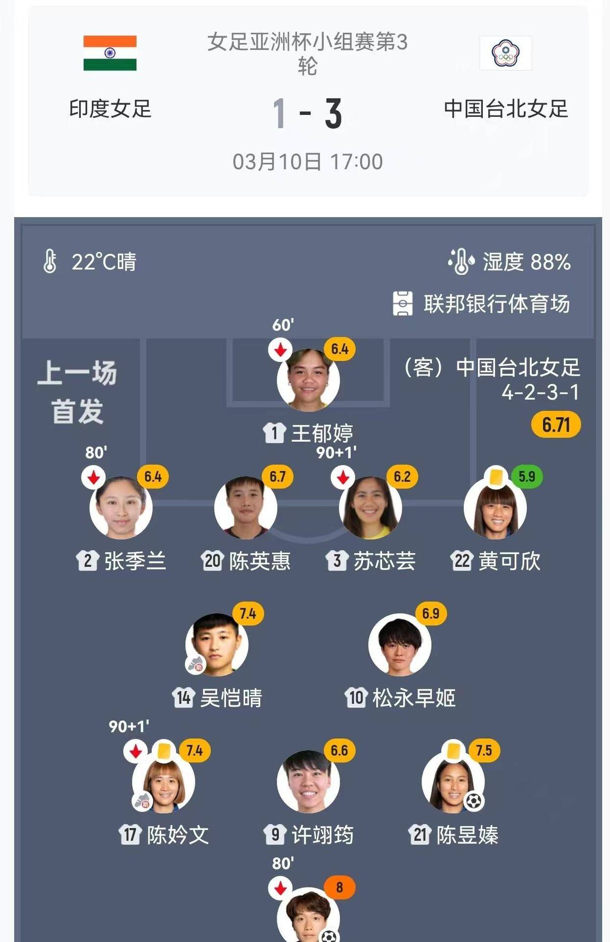 反观中国台北女足,她们在C组的表现可圈可点。 同组有亚洲霸主日本队,以及越南和印度。 首场比赛,她们0-2不敌日本,但防守端表现得相当顽强。 次轮,她们以1-0力克越南队,掌握了出线主动权。 小组赛最后一轮,面对必须取胜才有出线希望的印度队,中国台北女足踢出了一场充满戏剧性的比赛。 她们先是利用对手后卫的回传失误,由前锋苏育萱推射空门得手。 随后被印度队一记精彩的任意球世界波扳平。 上半场补时阶段,许翊筠主罚的点球击中门柱,反弹到印度门将背上弹入网窝,这个幸运的乌龙球让她们再次领先。 下半场,陈昱嫀接队友直塞形成单刀,冷静过掉门将后推射空门,将比分锁定为3-1,帮助球队以两胜一负积6分的成绩,力压越南队获得小组第二,成功晋级八强。
